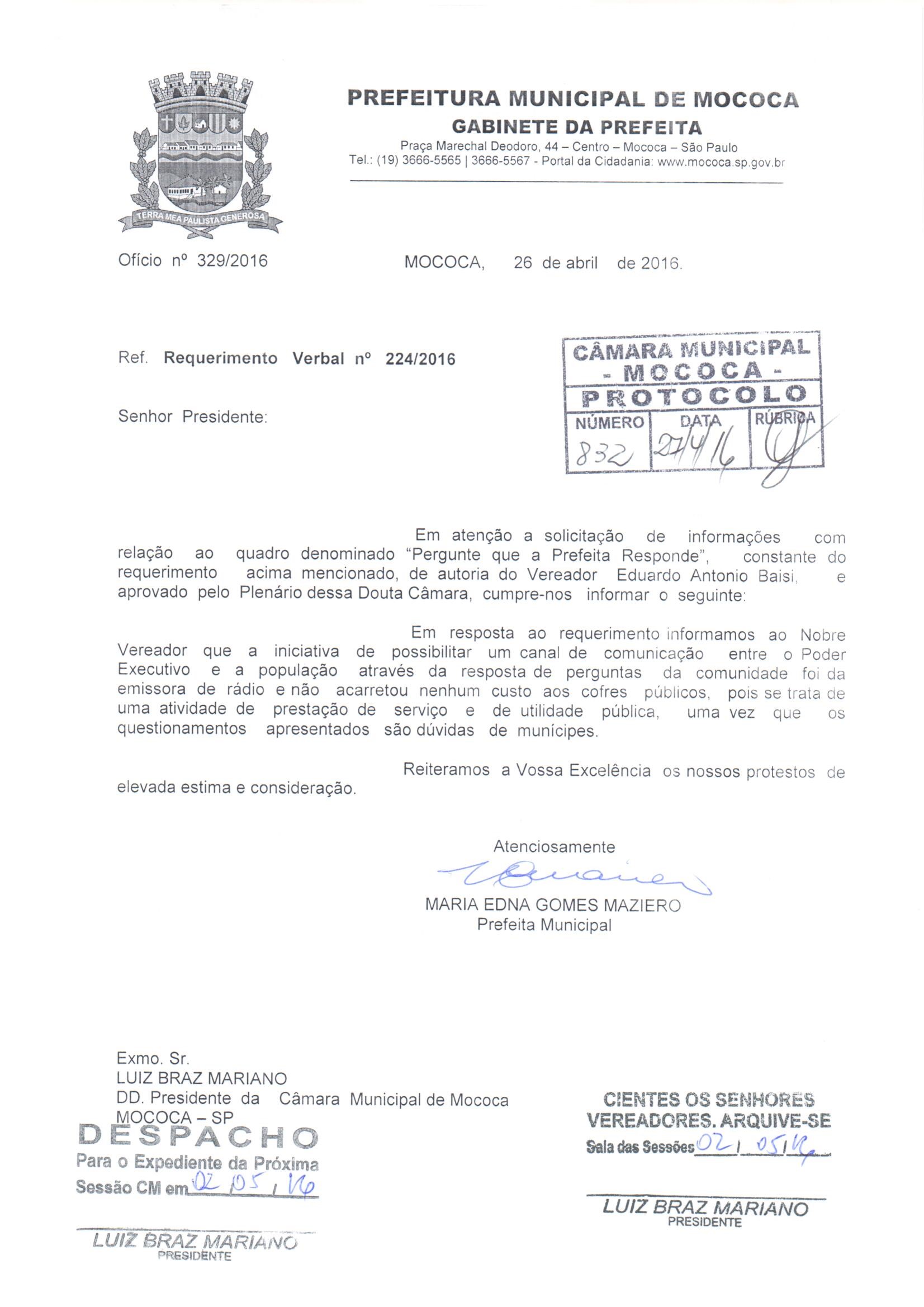 (Requerimento nº 224 de 2016)