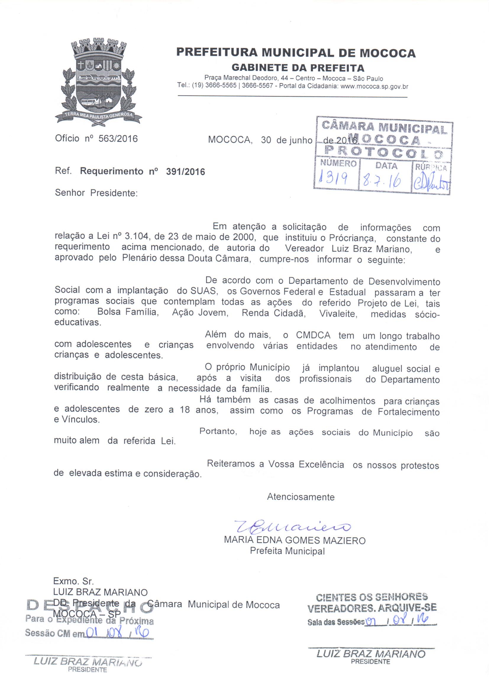 (Requerimento nº 391 de 2016)