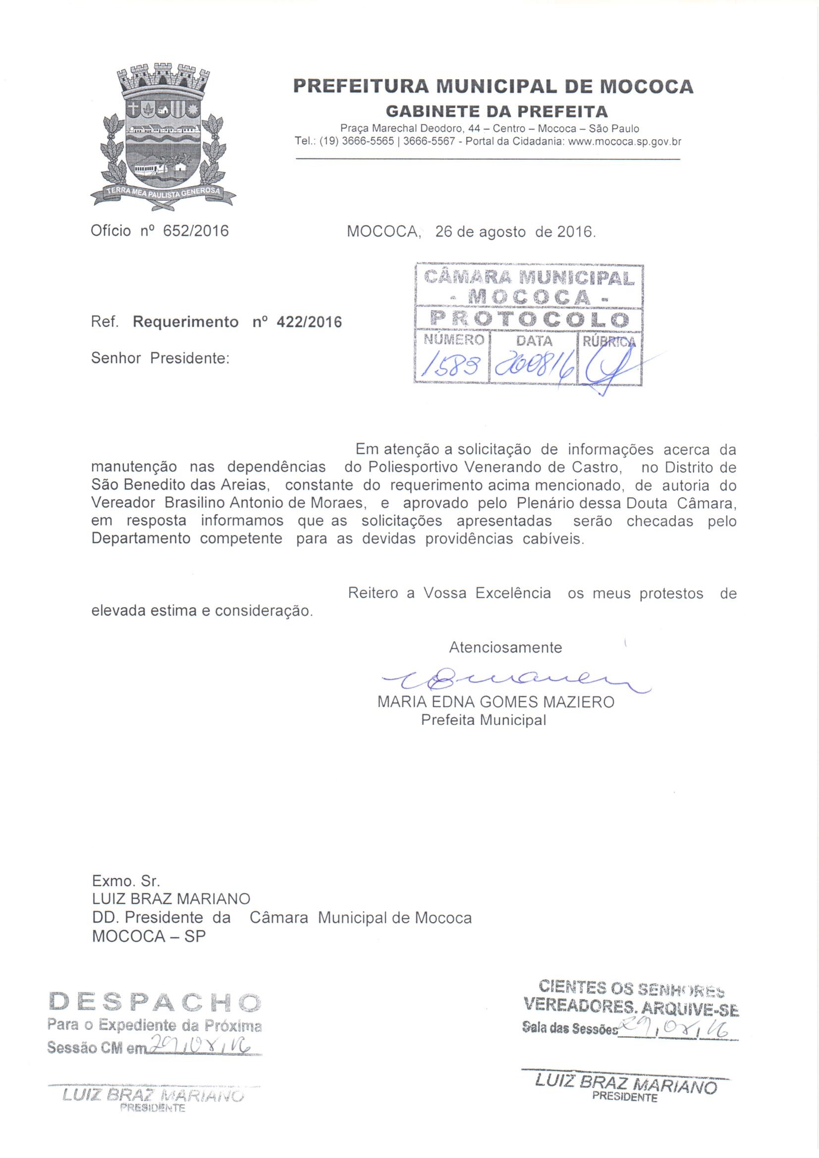 (Requerimento nº 422 de 2016)