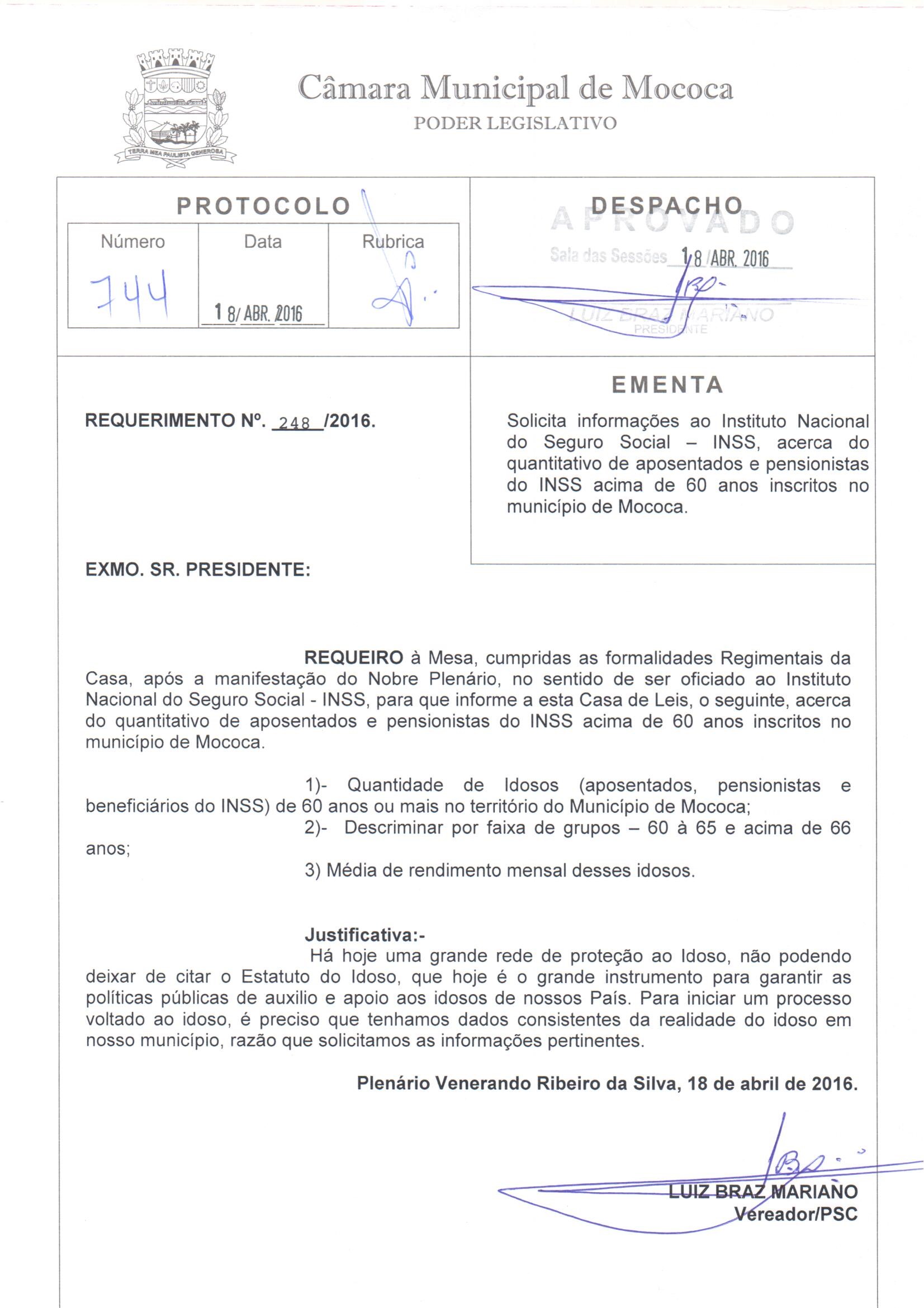 Ementa: N. 248/2016, SOLICITA INFORM. INSS, ACERCA DO QUANTITATIVO DE APOSENTADOS E PENSIONISTAS DO INSS ACIMA DE 60 ANOS INSCRITOS NO MUNICÍPIO.