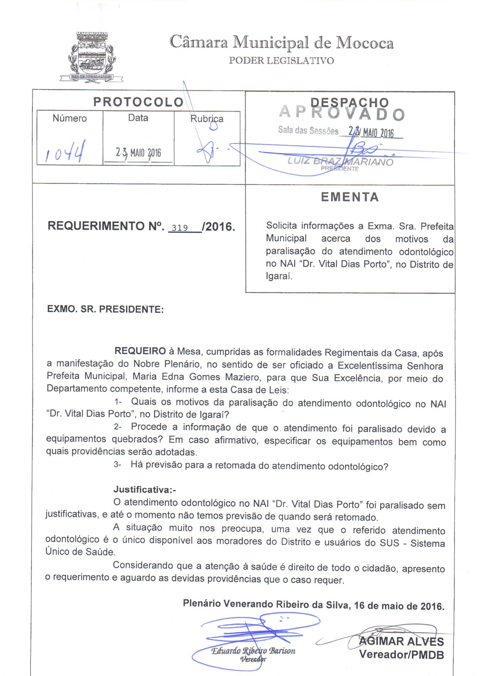 Ementa: N. 319/2016, SOLICITA INFORMAÇÕES PREFEITA SOBRE MOTIVOS DA PARALISAÇÃO DO ATENDIMENTO ODONTÓGICO NO NAI VITAL DIAS PORTO.