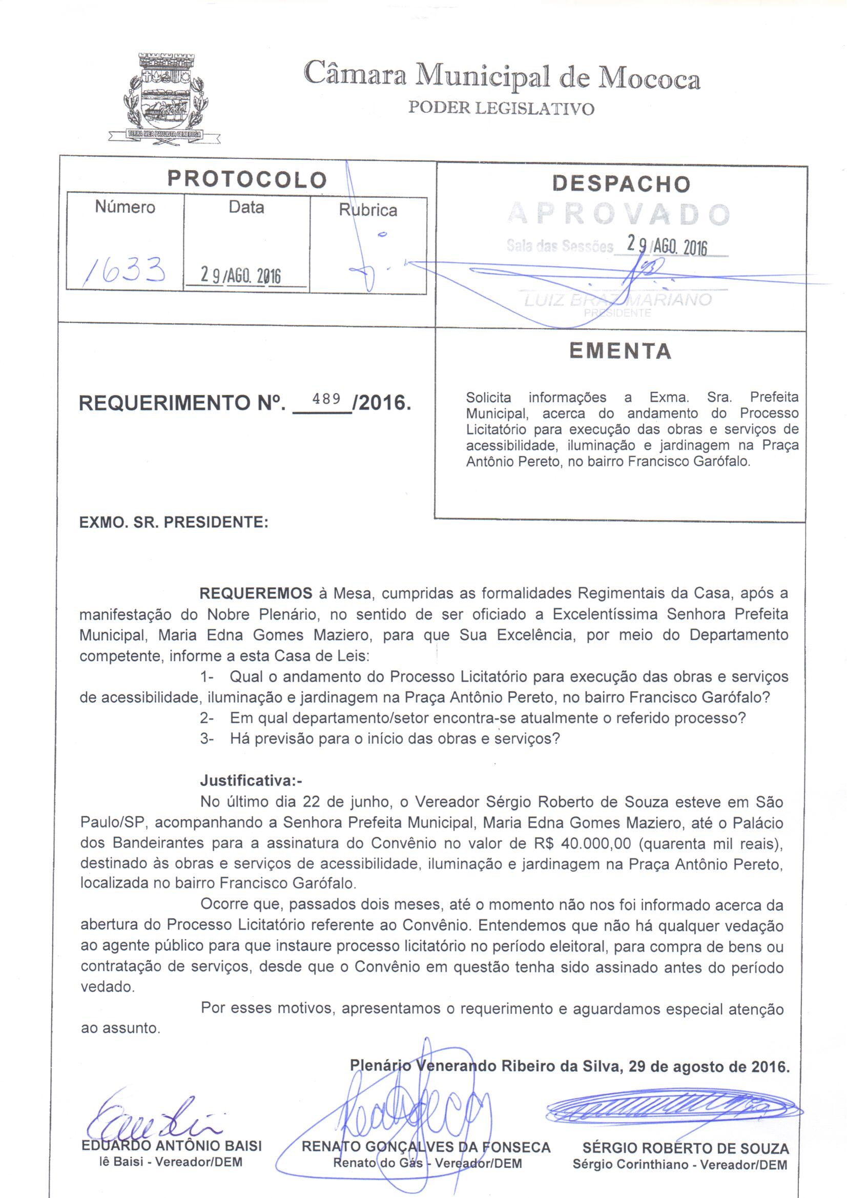 Ementa: REQUERIMENTO N. 489/2016, DE AUTORIA DOS VEREADORES EDUARDO ANTONIO BAISI, RENATO GONÇALVES DA FONSECA E SÉRGIO ROBERTO DE SOUZA, SOLICITA INFORMAÇÕES A PREFEITA MUNICIPAL ACERCA DO ANDAMENTO DO PROCESSO LICITATÓRIO PARA EXECUÇÃO DAS OBRAS E SERVIÇOS DE ACESSIBILIDADE, ILUMINAÇÃO E JARDINAGEM NA PRAÇA ANTONIO PERETO, FRANCISCO GARÓFALO.