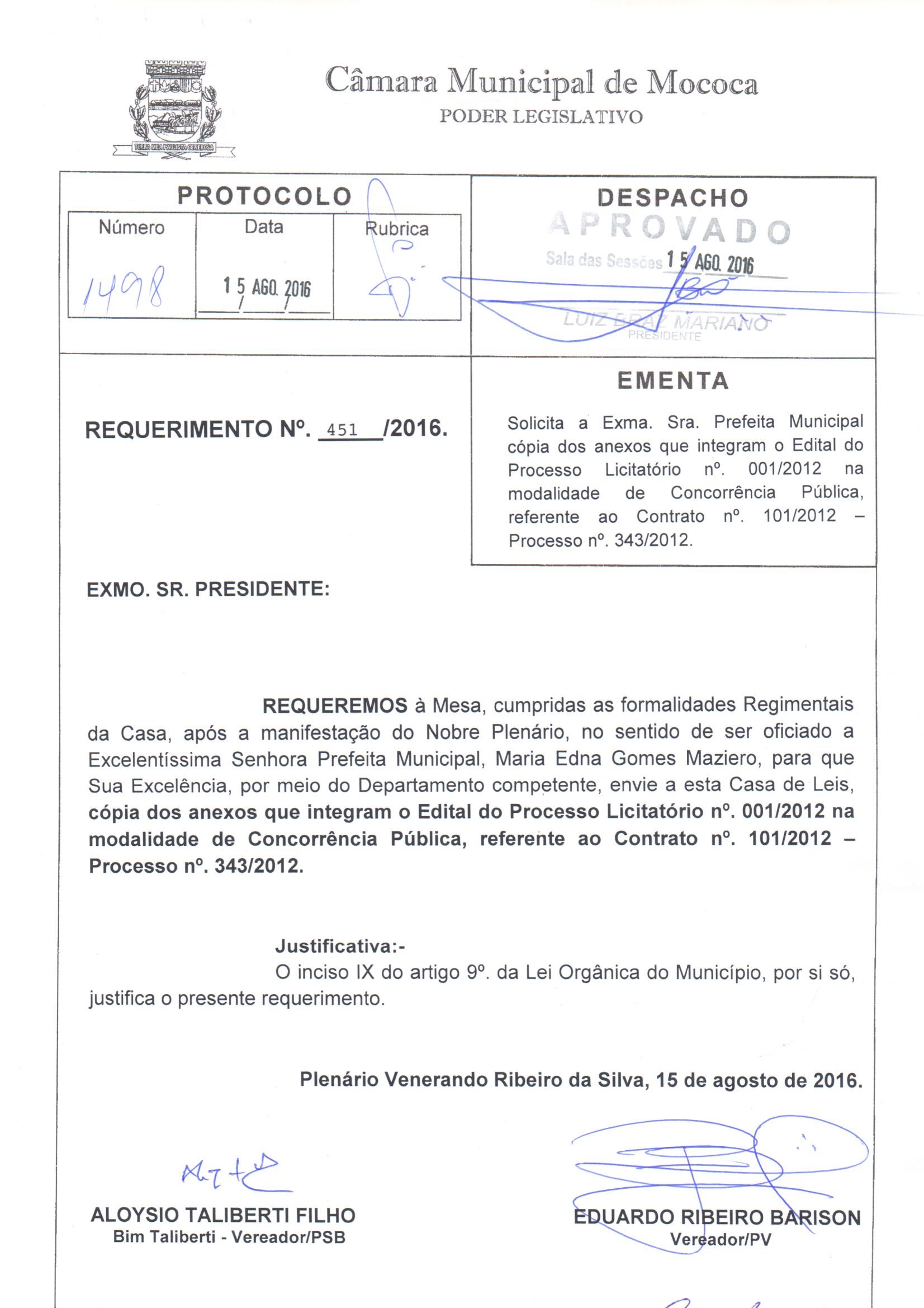 Ementa: REQUERIMENTO N. 451/2016, DE AUTORIA DOS VEREADORES ALOYSIO TALIBERTI FILHO E EDUARDO RIBEIRO BARISON, SOLICITA A SRA. PREFEITA MUNICIPAL, CÓPIA DOS ANEXOS QUE INTEGRAM O EDITAL DO PROCESSO LICITATÓRIO N. 001/2012, NA MODALIDADE DE CONCORRÊNCIA PÚBLICA, REFERENTE AO CONTRATO N. 101/2012-PROCESSO N. 343/2012.