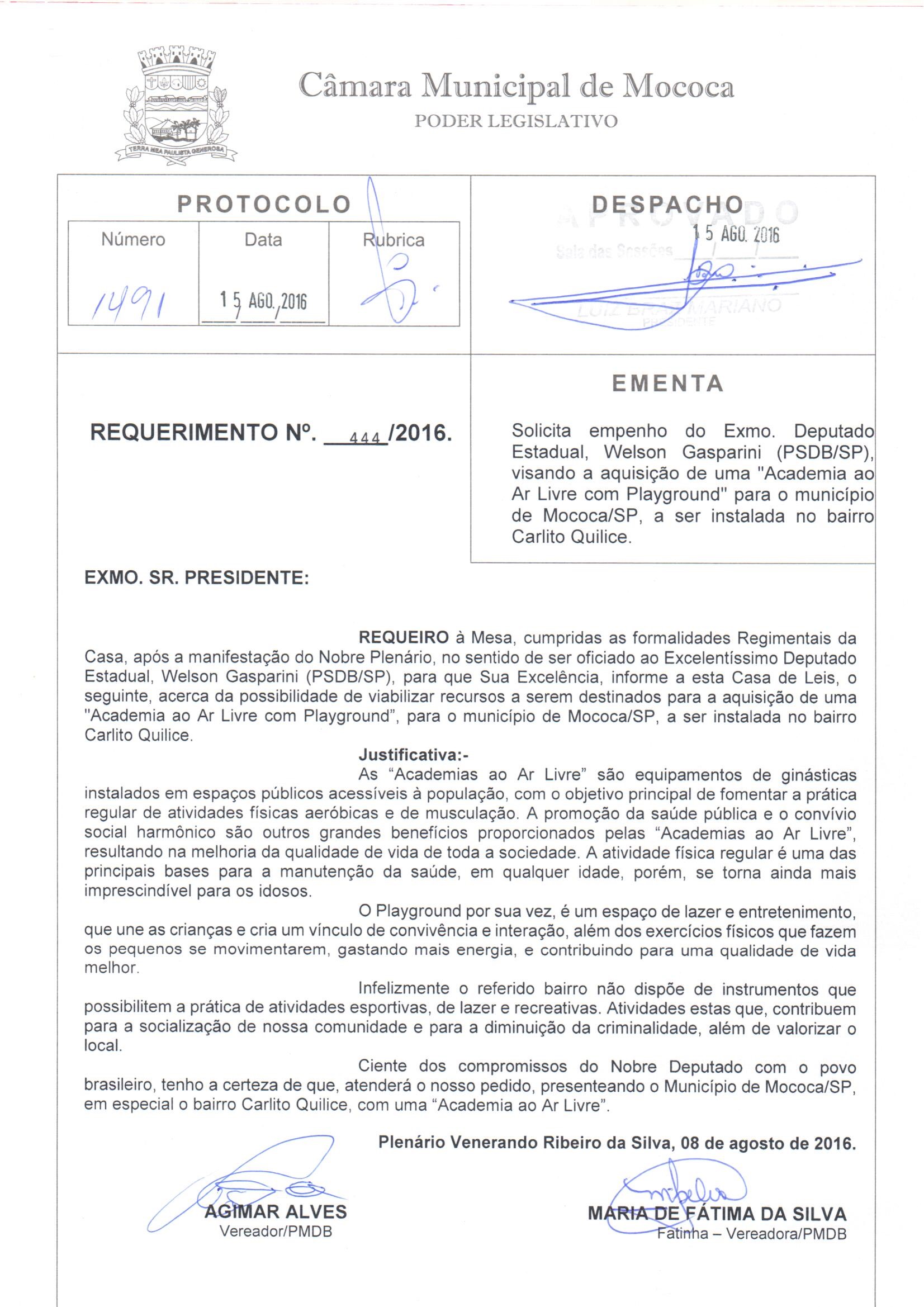 Ementa: REQUERIMENTO N. 444/2016, DE AUTORIA DA VEREADORA MARIA DE FÁTIMA DA SILVA, SOLICITA EMPENHO DO EXMO. DEPUTADO ESTADUAL, WELSON GASPARINI (PSDB/SP), VISANDO A AQUISIÇÃO DE UMA "ACADEMIA AO AR LIVRE COM PLAYGROUND" PARA O MUNICÍPIO DE MOCOCA/SP, A SER INSTALADA NO BAIRRO CARLITO QUILICE.