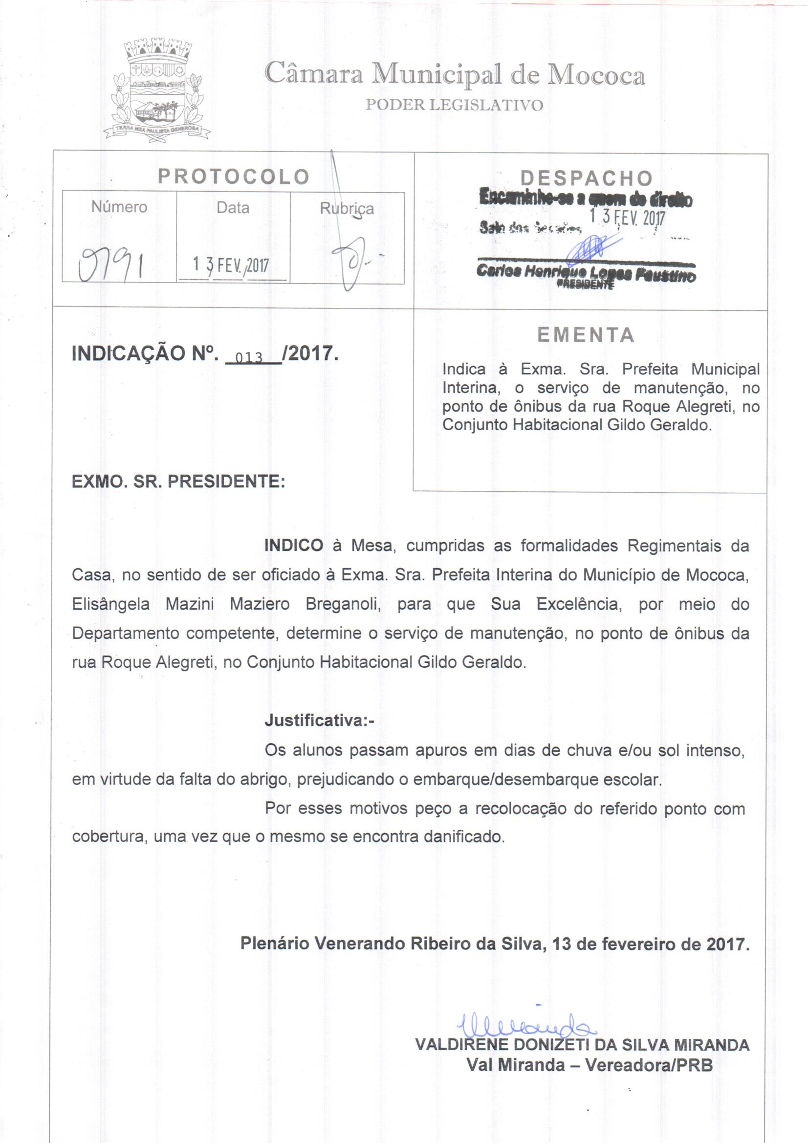 Ementa: INDICAÇÃO N. 013/2017, DA VEREADORA VALDIRENE MIRANDA, INDICA À EXMA. SRA. PREFEITA MUNICIPAL INTERINA, O SERVIÇO DE MANUTENÇÃO, NO PONTO DE ÔNIBUS DA RUA ROQUE ALEGRETI, NO CONJUNTO HABITACIONAL GILDO GERALDO.