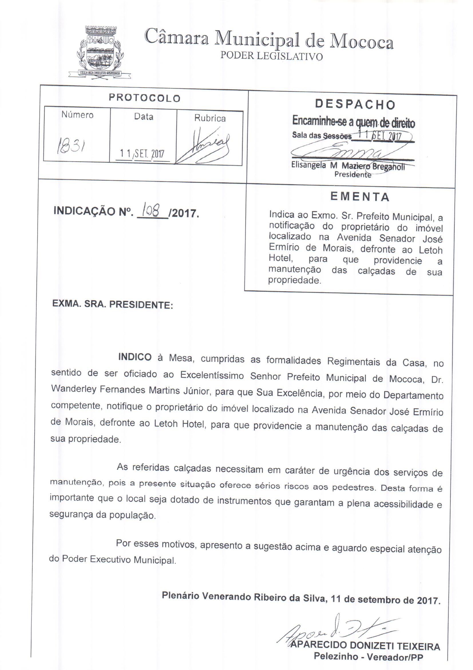 Ementa: INDICA AO EXMO. SR. PREFEITO MUNICIPAL, A NOTIFICAÇÃO DO PROPRIETÁRIO DO IMÓVEL LOCALIZADO NA AVENIDA SENADOR JOSÉ ERMÍRIO DE MORAIS, DEFRONTE AO LETOH HOTEL, PARA QUE PROVIDENCIE A MANUTENÇÃO DAS CALÇADAS DE SUA PROPRIEDADE.
