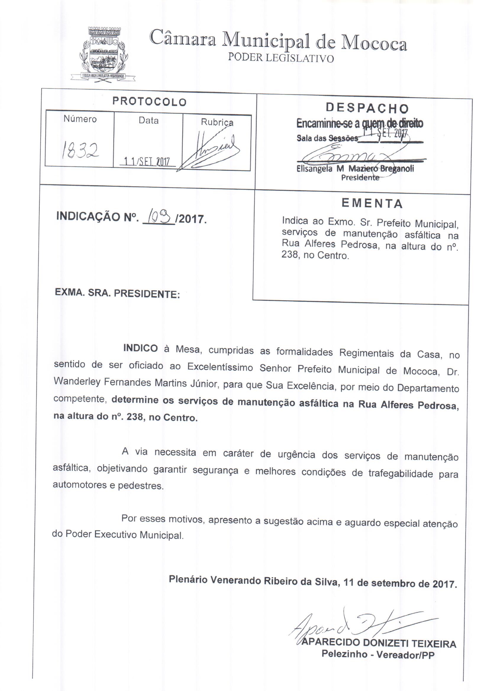 Ementa: INDICA AO EXMO. SR. PREFEITO MUNICIPAL, SERVIÇOS DE MANUTENÇÃO ASFÁLTICA NA RUA ALFERES PEDROSA, NA ALTURA DO Nº. 238, NO CENTRO.