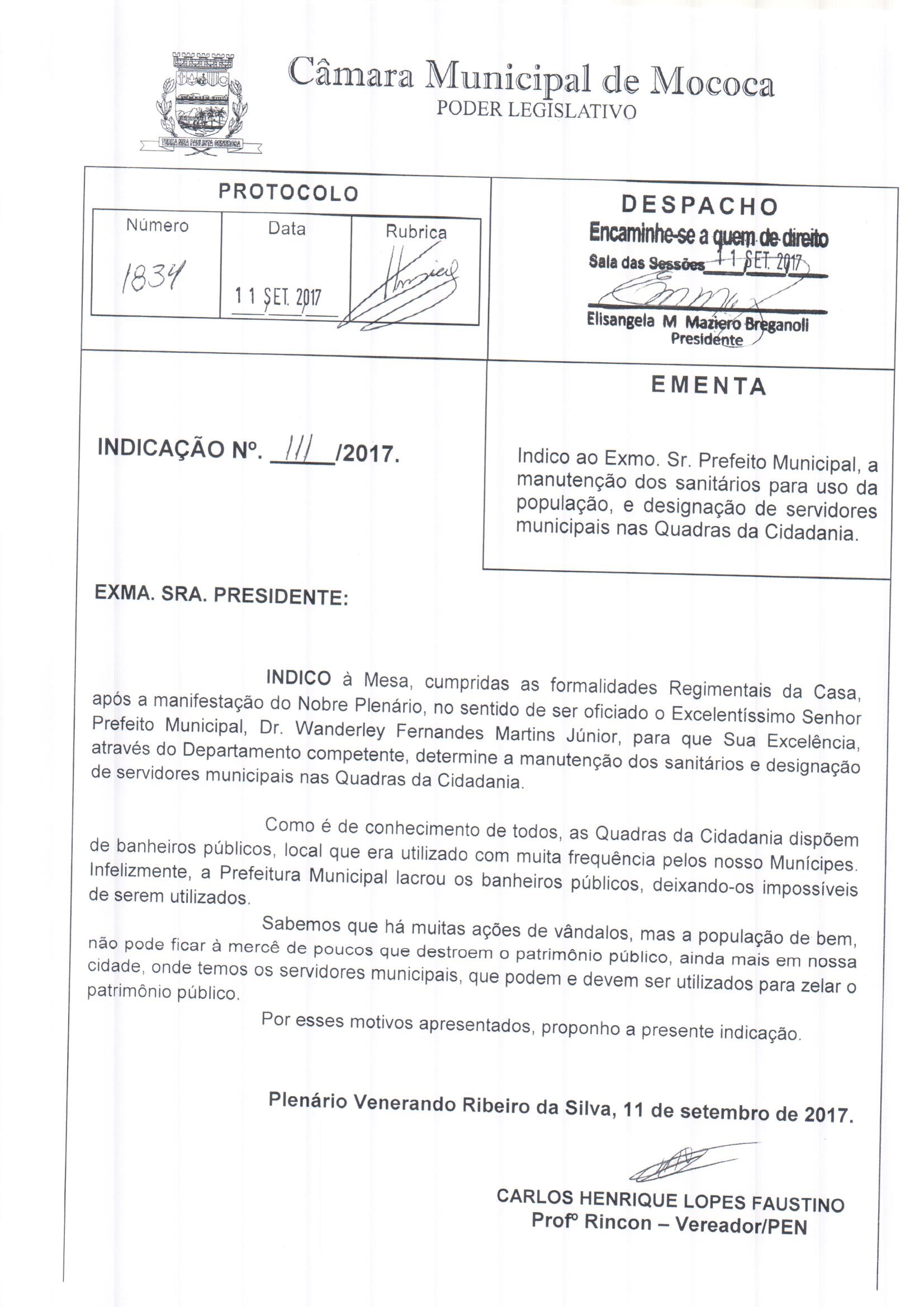Ementa: INDICO AO EXMO. SR. PREFEITO MUNICIPAL, A MANUTENÇÃO DOS SANITÁRIOS PARA USO DA POPULAÇÃO, E DESIGNAÇÃO DE SERVIDORES MUNICIPAIS NAS QUADRAS DA CIDADANIA.