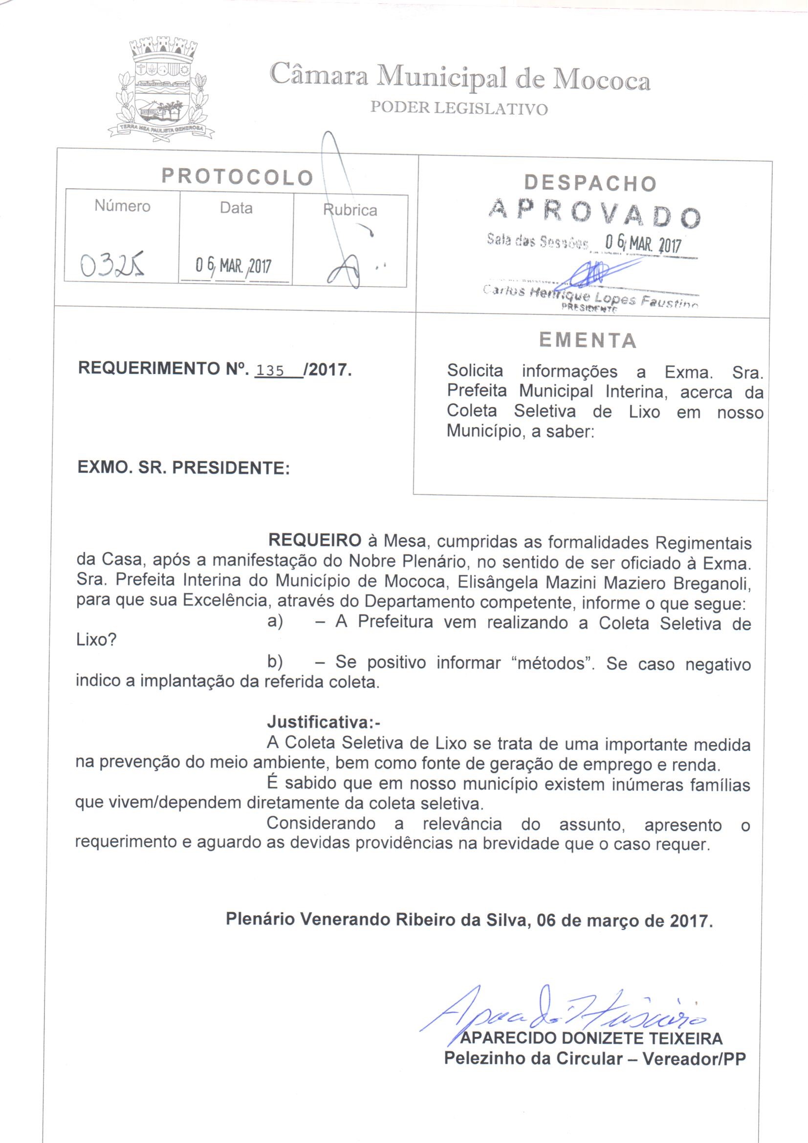 REQUERIMENTO N. 135/2017, DO VEREADOR APARECIDO DONIZETE TEIXEIRA, SOLICITA INFORMAÇÕES A PREFEITA MUNICIPAL INTERINA, ACERCA DA COLETA SELETIVA DE LIXO EM NOSSO MUNICÍPIO. - REQUERIMENTO N. 135/2017, DO VEREADOR APARECIDO DONIZETE TEIXEIRA, SOLICITA INFORMAÇÕES A PREFEITA MUNICIPAL INTERINA, ACERCA DA COLETA SELETIVA DE LIXO EM NOSSO MUNICÍPIO.