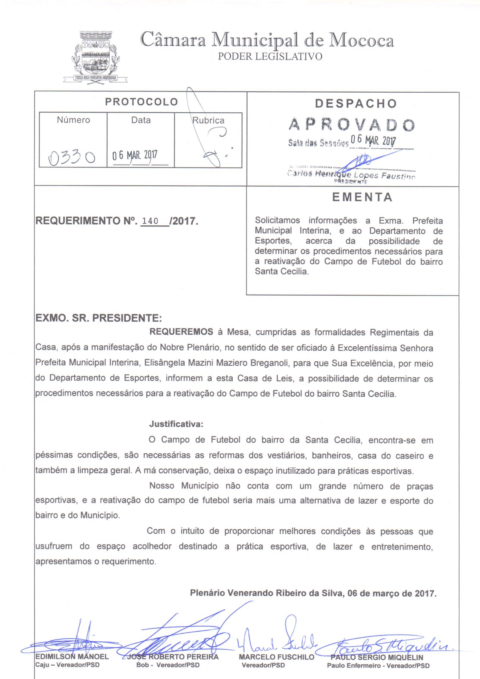 REQUERIMENTO N. 140/2017, DOS VEREADORES EDIMILSON MANOEL, JOSÉ ROBERTO PEREIRA, MARCELO FUSCHILO E PAULO SÉRGIO MIQUELIN, SOLICITAMOS INFORMAÇÕES A EXMA. PREFEITA MUNICIPAL INTERINA, E AO DEPARTAMENTO DE ESPORTES, ACERCA DA POSSIBILIDADE DE DETERMINAR OS PROCEDIMENTOS NECESSÁRIOS PARA A REATIVAÇÃO DO CAMPO DE FUTEBOL DO BAIRRO SANTA CECILIA. - REQUERIMENTO N. 140/2017, DOS VEREADORES EDIMILSON MANOEL, JOSÉ ROBERTO PEREIRA, MARCELO FUSCHILO E PAULO SÉRGIO MIQUELIN, SOLICITAMOS INFORMAÇÕES A EXMA. PREFEITA MUNICIPAL INTERINA, E AO DEPARTAMENTO DE ESPORTES, ACERCA DA POSSIBILIDADE DE DETERMINAR OS PROCEDIMENTOS NECESSÁRIOS PARA A REATIVAÇÃO DO CAMPO DE FUTEBOL DO BAIRRO SANTA CECILIA.