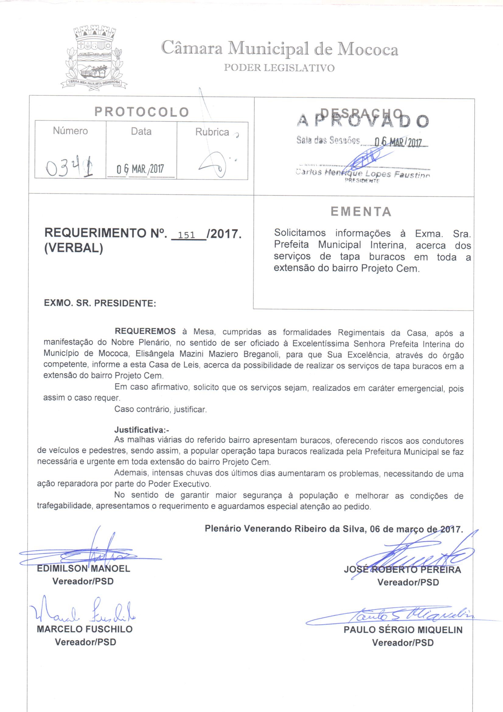 REQUERIMENTO VERBAL N. 151/2017, DOS VEREADORES EDIMILSON MANOEL, JOSÉ ROBERTO PEREIRA, MARCELO FUSCHILO E PAULO SÉGIO MIQUELIN, SOLICITAMOS INFORMAÇÕES À EXMA. SRA. PREFEITA MUNICIPAL INTERINA, ACERCA DOS SERVIÇOS DE TAPA BURACOS EM TODA A EXTENSÃO DO BAIRRO PROJETO CEM. - REQUERIMENTO VERBAL N. 151/2017, DOS VEREADORES EDIMILSON MANOEL, JOSÉ ROBERTO PEREIRA, MARCELO FUSCHILO E PAULO SÉGIO MIQUELIN, SOLICITAMOS INFORMAÇÕES À EXMA. SRA. PREFEITA MUNICIPAL INTERINA, ACERCA DOS SERVIÇOS DE TAPA BURACOS EM TODA A EXTENSÃO DO BAIRRO PROJETO CEM.
