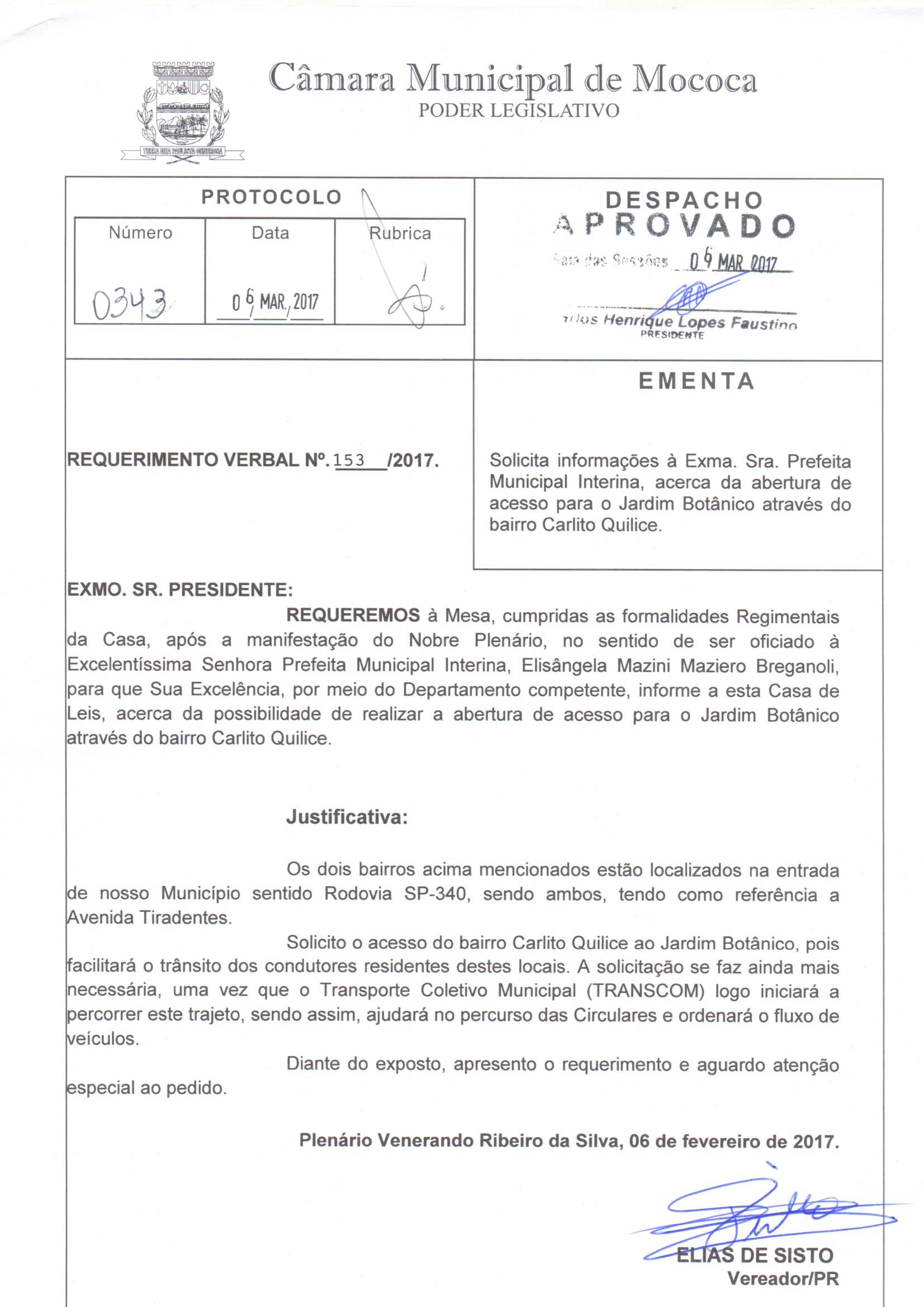 REQUERIMENTO VERBAL N. 153/2017, DO VEREADOR ELIAS DE SISTO, SOLICITA INFORMAÇÕES À EXMA. SRA. PREFEITA MUNICIPAL INTERINA, ACERCA DA ABERTURA DE ACESSO PARA O JARDIM BOTÂNICO ATRAVÉS DO BAIRRO CARLITO QUILICE. - REQUERIMENTO VERBAL N. 153/2017, DO VEREADOR ELIAS DE SISTO, SOLICITA INFORMAÇÕES À EXMA. SRA. PREFEITA MUNICIPAL INTERINA, ACERCA DA ABERTURA DE ACESSO PARA O JARDIM BOTÂNICO ATRAVÉS DO BAIRRO CARLITO QUILICE.