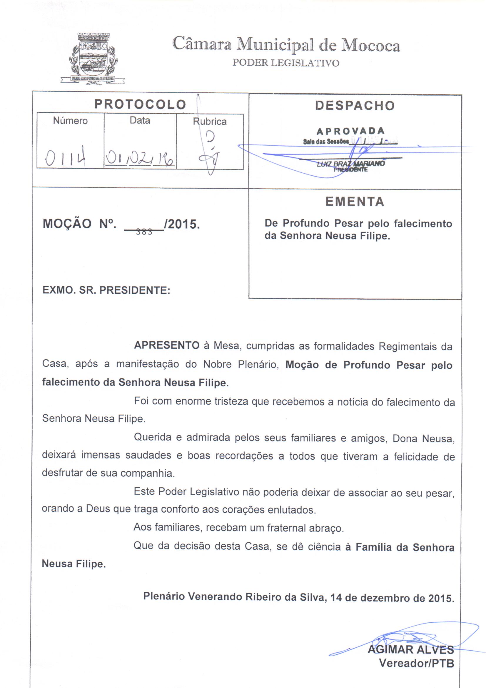 N. 383/2015 - DE PROFUNDO PESAR PELO FALECIMENTO DA SENHORA NEUSA FILIPE. - N. 383/2015 - DE PROFUNDO PESAR PELO FALECIMENTO DA SENHORA NEUSA FILIPE.
