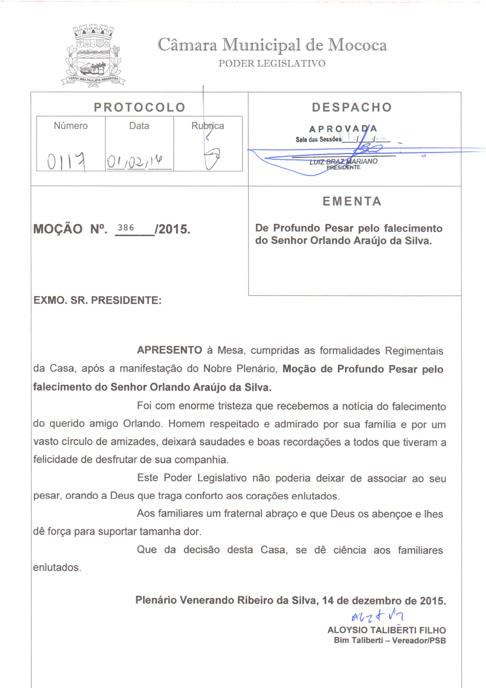 N. 386/2015 - DE PROFUNDO PESAR PELO FALECIMENTO DO SR. ORLANDO ARAÚJO DA SILVA. - N. 386/2015 - DE PROFUNDO PESAR PELO FALECIMENTO DO SR. ORLANDO ARAÚJO DA SILVA.