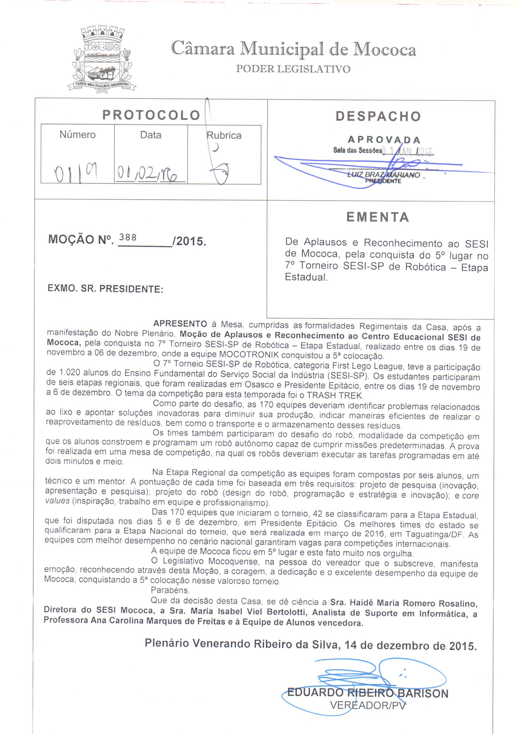 388/2015 - DE APLAUSOS E RECONHECIMENTO AO SESI DE MOCOCA, PELA CONQUISTA DO 5º LUGAR NO 7º TORNEIRO SESI-SP DE ROBÓTICA – ETAPA ESTADUAL. - 388/2015 - DE APLAUSOS E RECONHECIMENTO AO SESI DE MOCOCA, PELA CONQUISTA DO 5º LUGAR NO 7º TORNEIRO SESI-SP DE ROBÓTICA – ETAPA ESTADUAL.