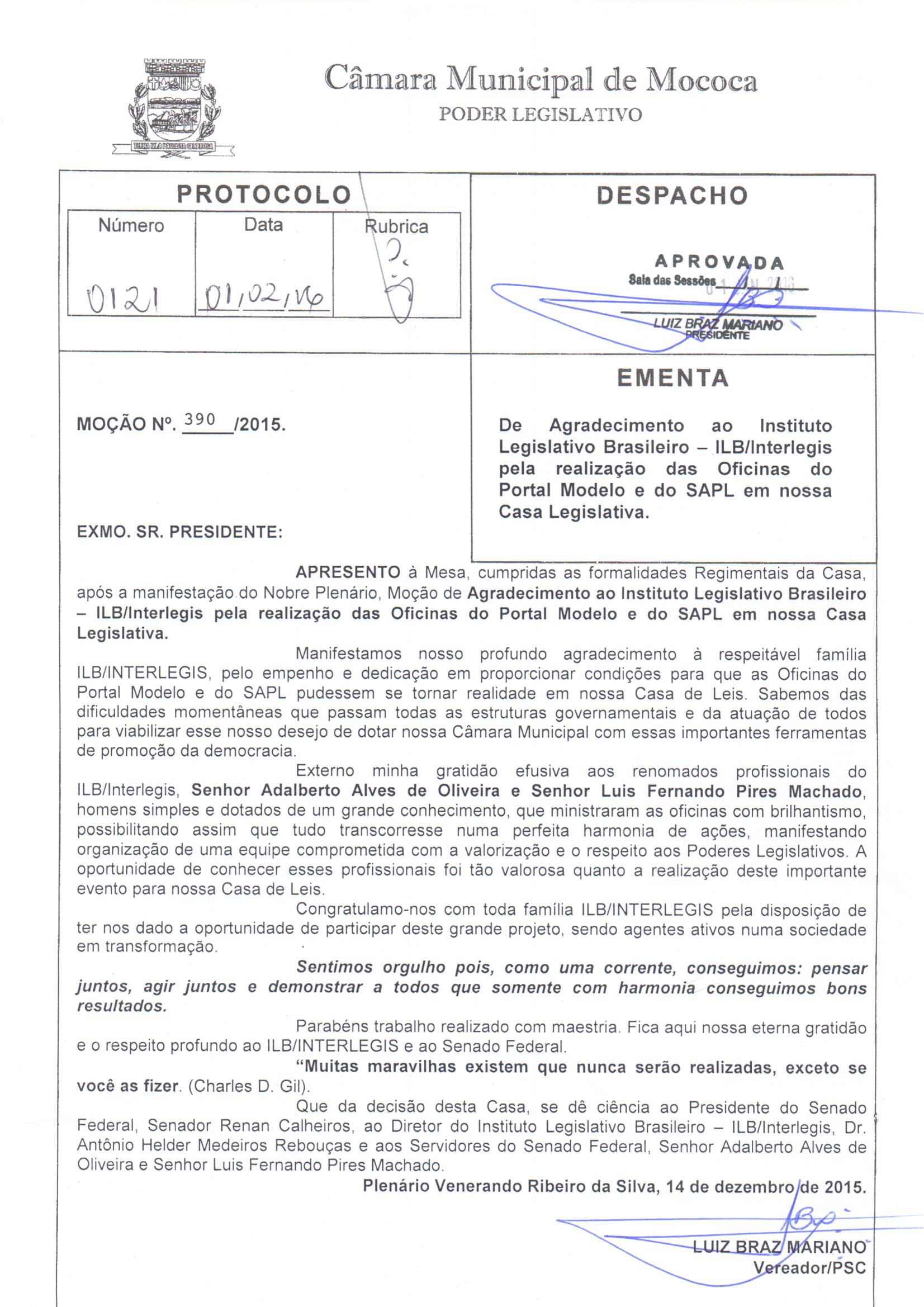 N. 390/2015 - DE AGRADECIMENTO AO INSTITUTO LEGISLATIVO BRASILEIRO - ILB/INTERLEGIS, PELA REALIZAÇÃO DAS OFICINAS DO PORTAL MODELO E DO SAPL EM NOSSA CASA LEGISLATIVA. - N. 390/2015 - DE AGRADECIMENTO AO INSTITUTO LEGISLATIVO BRASILEIRO - ILB/INTERLEGIS, PELA REALIZAÇÃO DAS OFICINAS DO PORTAL MODELO E DO SAPL EM NOSSA CASA LEGISLATIVA.