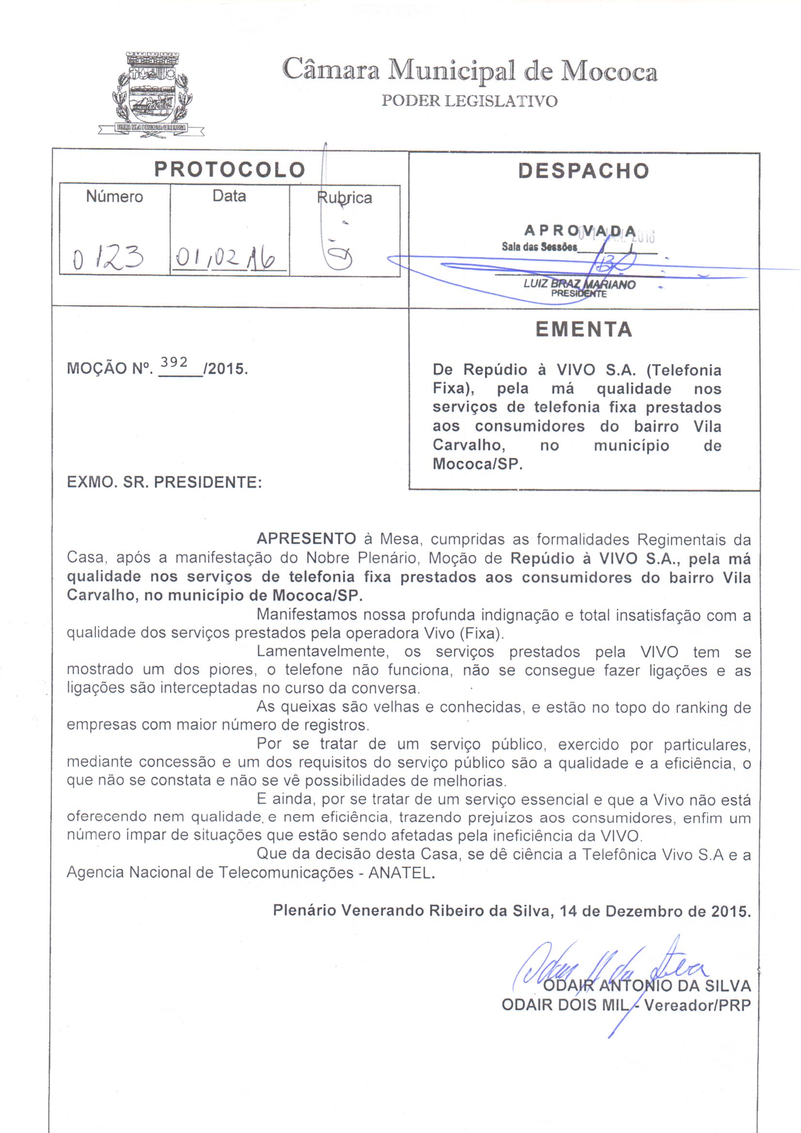 N. 392/2015 - DE REPÚDIO A VIVO S.A., PELA MÁ QUALIDADE NOS SERVIÇOS DE TELEFONIA FIXA PRESTADOS AOS CONSUMIDORES DO BAIRRO VILA CARVALHO, MUNICÍPIO DE MOCOCA/SP. - N. 392/2015 - DE REPÚDIO A VIVO S.A., PELA MÁ QUALIDADE NOS SERVIÇOS DE TELEFONIA FIXA PRESTADOS AOS CONSUMIDORES DO BAIRRO VILA CARVALHO, MUNICÍPIO DE MOCOCA/SP.