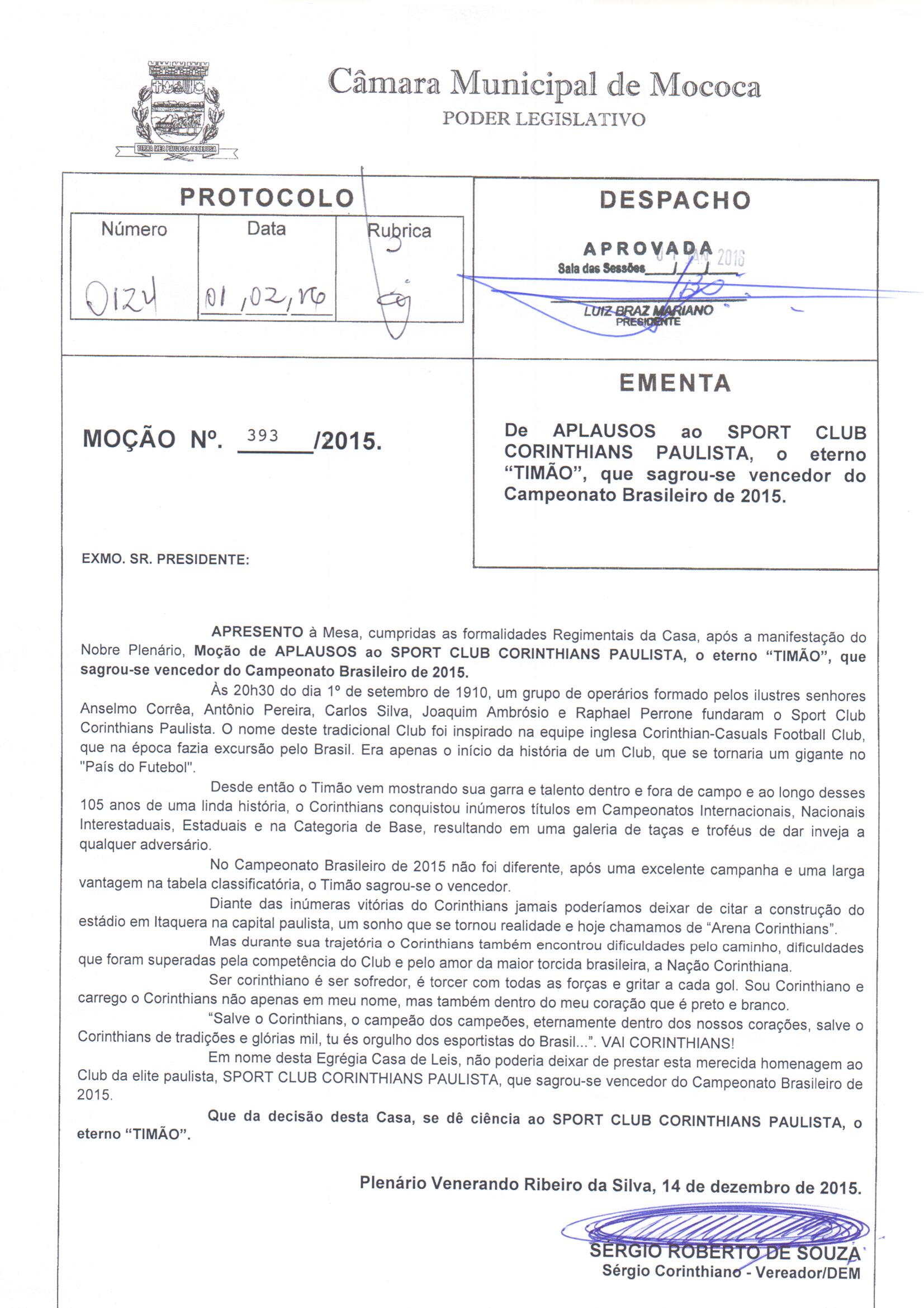 N. 393/2015 - DE APLAUSOS AO SPORT CLUB CORINTHIANS PAULISTA, O ETERNO TIMÃO, QUE SAGROU-SE VENCEDOR DO CAMPEONATO BRASILEIRO DE 2015. - N. 393/2015 - DE APLAUSOS AO SPORT CLUB CORINTHIANS PAULISTA, O ETERNO TIMÃO, QUE SAGROU-SE VENCEDOR DO CAMPEONATO BRASILEIRO DE 2015.