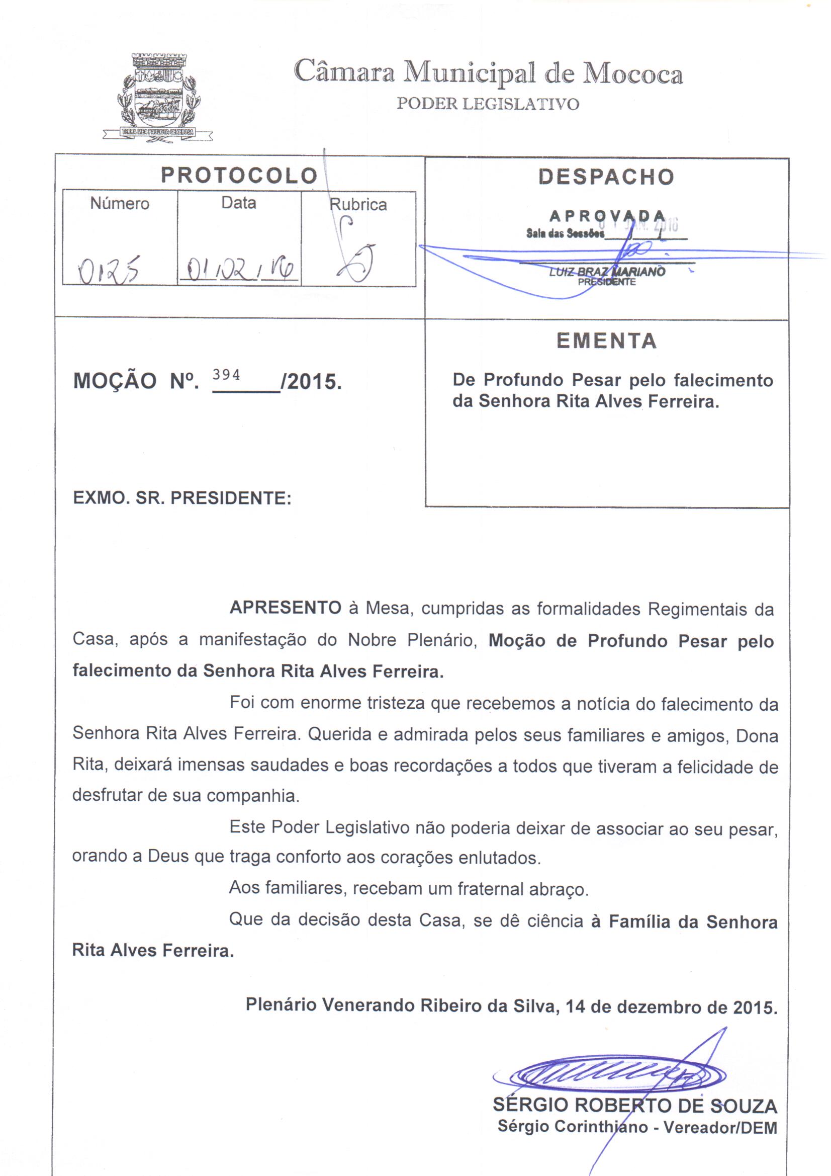 N. 394/2015 - DE PROFUNDO PESAR PELO FALECIMENTO DA SENHORA RITA ALVES FERREIRA. - N. 394/2015 - DE PROFUNDO PESAR PELO FALECIMENTO DA SENHORA RITA ALVES FERREIRA.