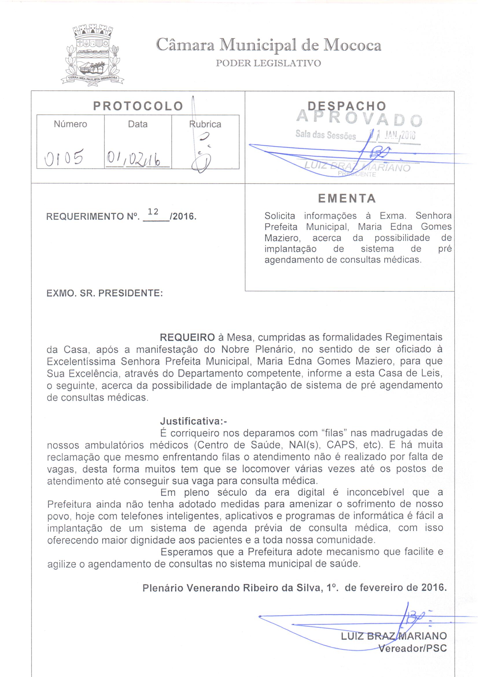 N. 12/2016 - SOLICITA INFORMAÇÕES À EXMA. SENHORA PREFEITA MUNICIPAL, MARIA EDNA GOMES MAZIERO, ACERCA DA POSSIBILIDADE DE IMPLANTAÇÃO DE SISTEMA DE PRÉ AGENDAMENTO DE CONSULTAS MÉDICAS. - N. 12/2016 - SOLICITA INFORMAÇÕES À EXMA. SENHORA PREFEITA MUNICIPAL, MARIA EDNA GOMES MAZIERO, ACERCA DA POSSIBILIDADE DE IMPLANTAÇÃO DE SISTEMA DE PRÉ AGENDAMENTO DE CONSULTAS MÉDICAS.