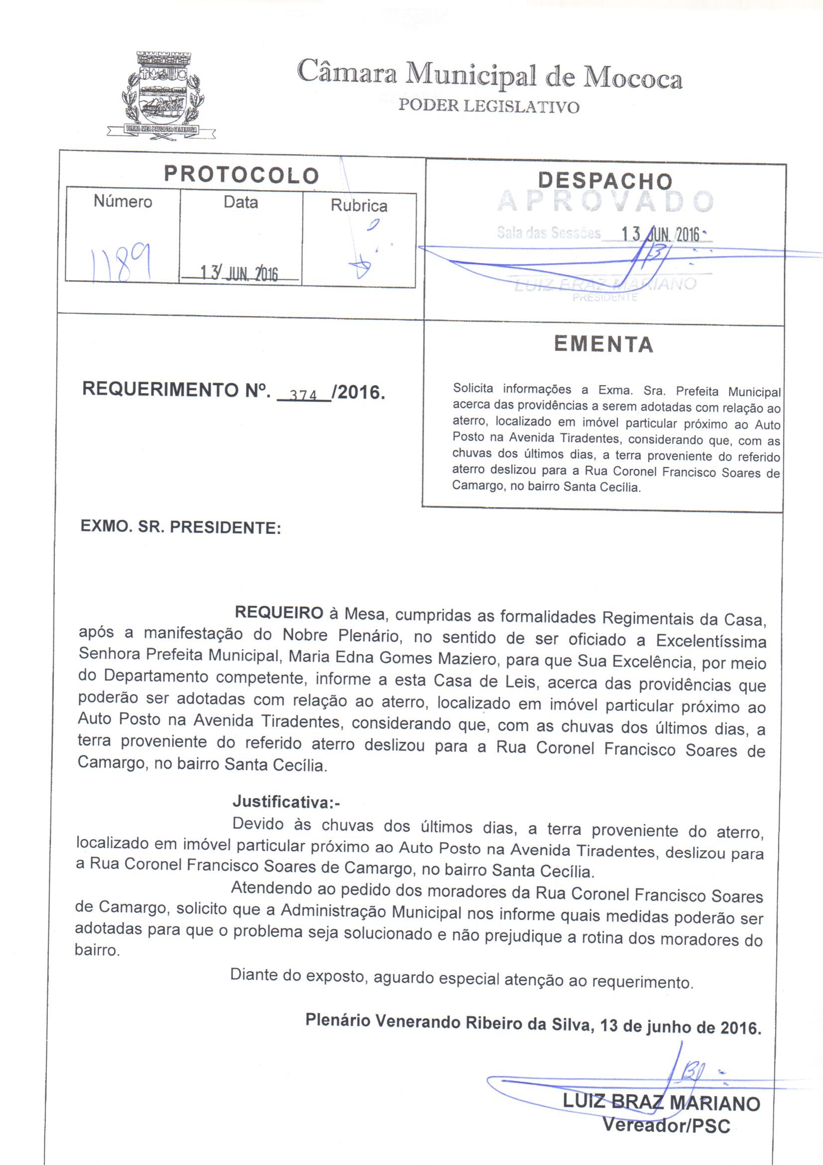 N. 374/2016, SOLICITA INFORM. PREFEITA ACERCA PROVIDENCIAS COM RELAÇÃO AO ATERRO, LOCALIZADO EM IMÓVEL PARTICULAR PRÓXIMO AO AUTO POSTO NA AV. TIRADENTES, CONSIDERANDO QUE, A TERRA DO REFERIDO ATERRO DESLIZOU PARA A RUA CORONEL FRANCISCO SOARES DE CAMARGO. - N. 374/2016, SOLICITA INFORM. PREFEITA ACERCA PROVIDENCIAS COM RELAÇÃO AO ATERRO, LOCALIZADO EM IMÓVEL PARTICULAR PRÓXIMO AO AUTO POSTO NA AV. TIRADENTES, CONSIDERANDO QUE, A TERRA DO REFERIDO ATERRO DESLIZOU PARA A RUA CORONEL FRANCISCO SOARES DE CAMARGO.