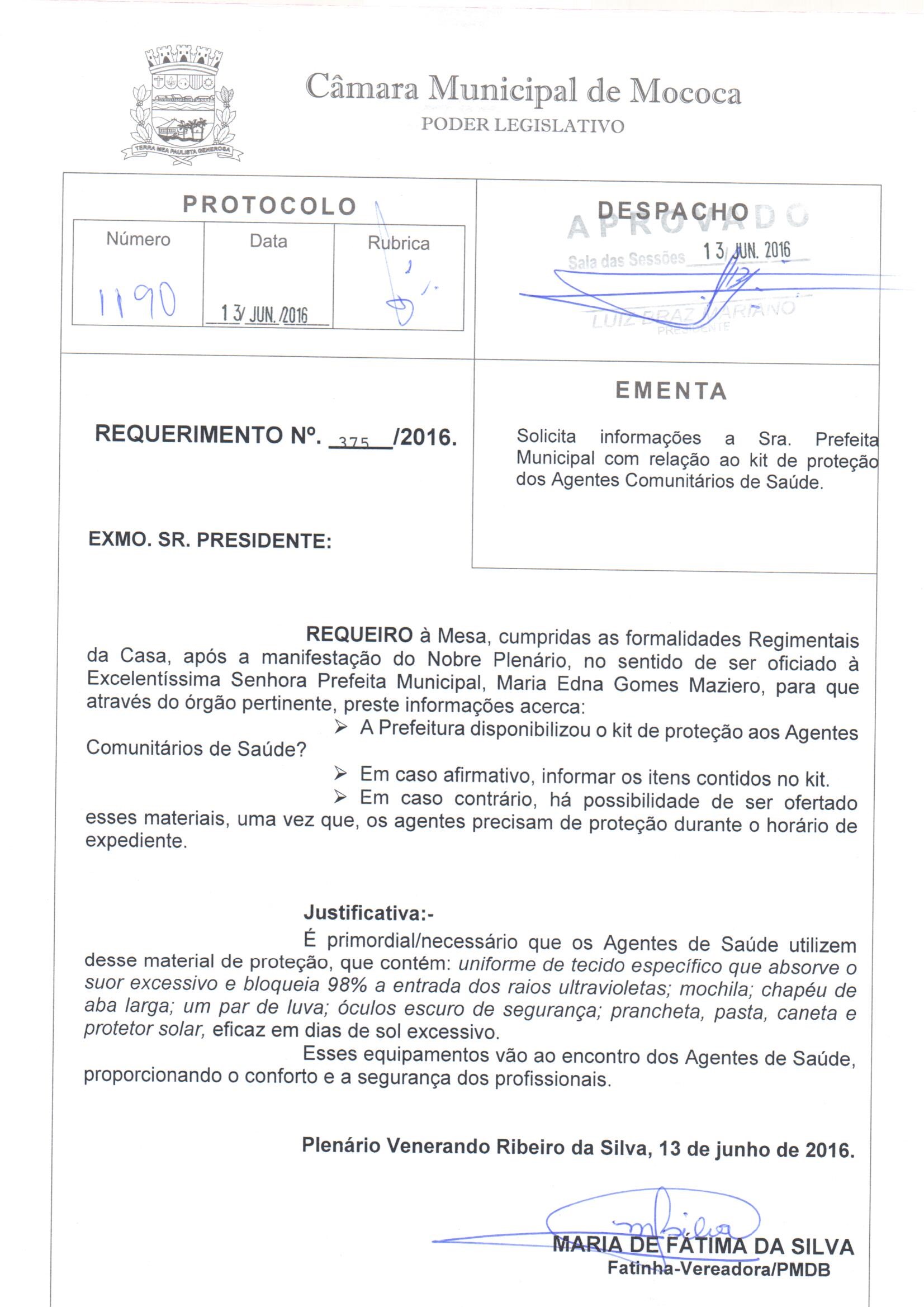 N. 375/2016, SOLICITA INFORM. PREFEITA COM RELAÇÃO AO KIT DE PROTEÇÃO DOS AGENTES COMUNITÁRIOS DE SAÚDE. - N. 375/2016, SOLICITA INFORM. PREFEITA COM RELAÇÃO AO KIT DE PROTEÇÃO DOS AGENTES COMUNITÁRIOS DE SAÚDE.