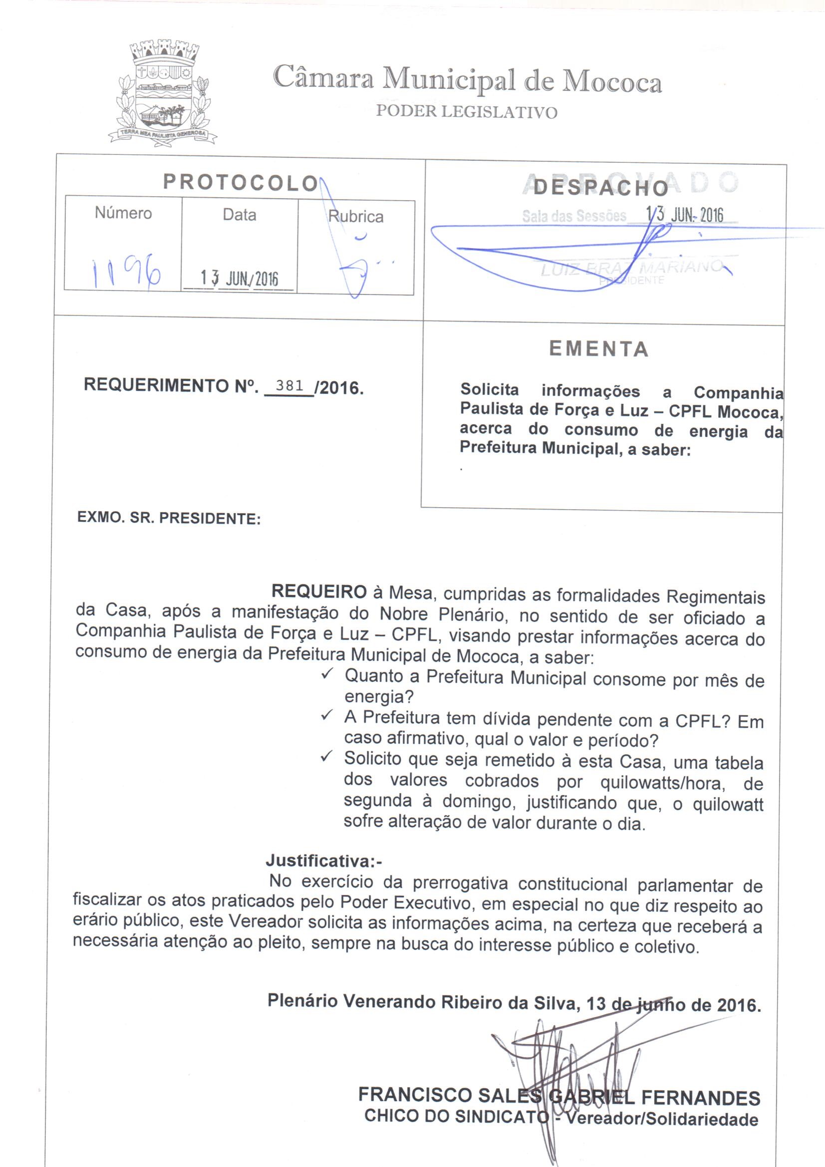 N. 381/2016, SOLICITA INFORM. CPFL, ACERCA DO CONSUMO DE ENERGIA DA PREFEITURA MUNICIPAL. - N. 381/2016, SOLICITA INFORM. CPFL, ACERCA DO CONSUMO DE ENERGIA DA PREFEITURA MUNICIPAL.
