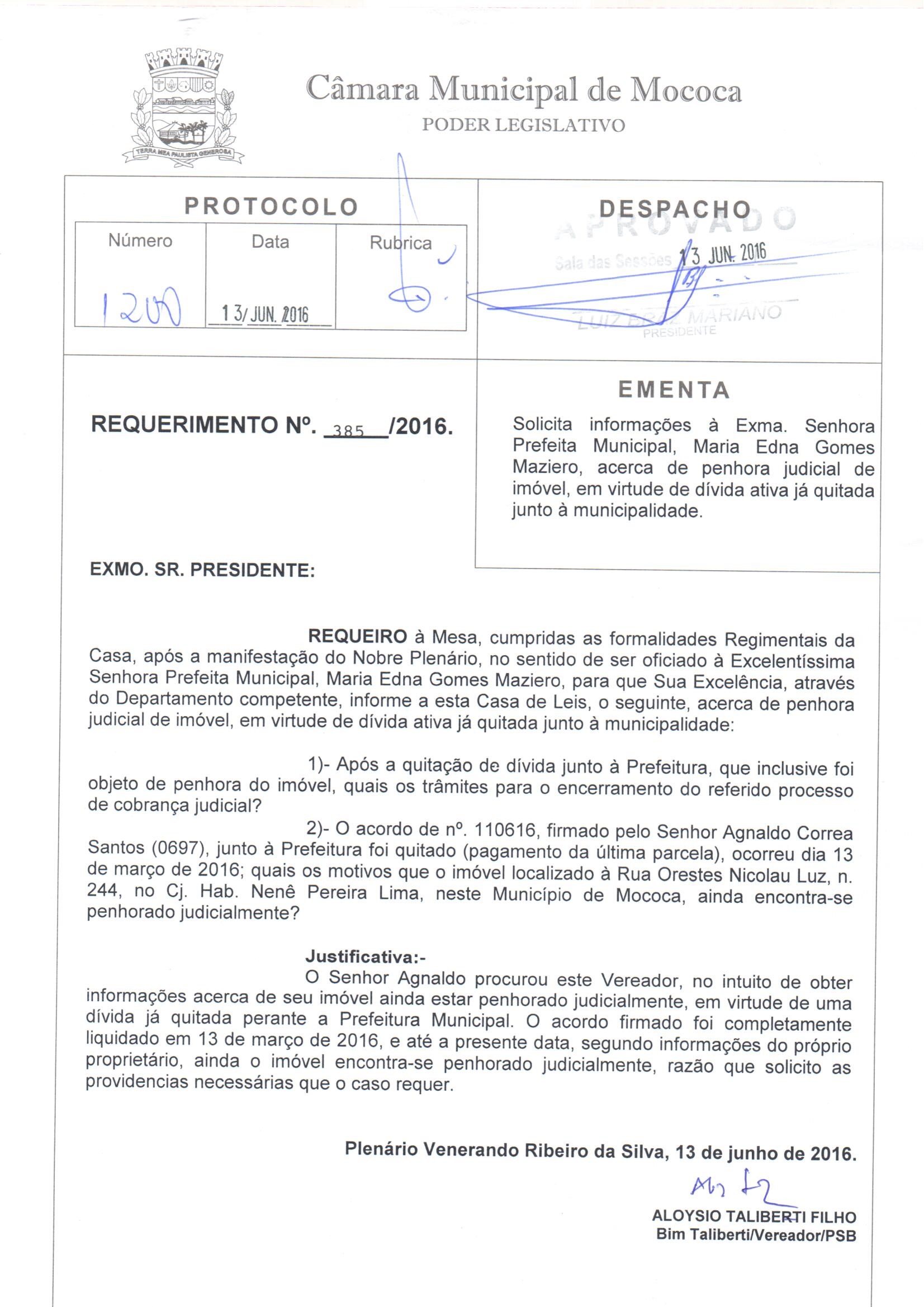 N. 385/2016, SOLICITA INFORM. PREFEITA SOBRE PENHORA JUDICIAL DE IMÓVEL, EM VIRTUDE DE DÍVIDA ATIVA JÁ QUITADA JUNTO A PREFEITURA. - N. 385/2016, SOLICITA INFORM. PREFEITA SOBRE PENHORA JUDICIAL DE IMÓVEL, EM VIRTUDE DE DÍVIDA ATIVA JÁ QUITADA JUNTO A PREFEITURA.